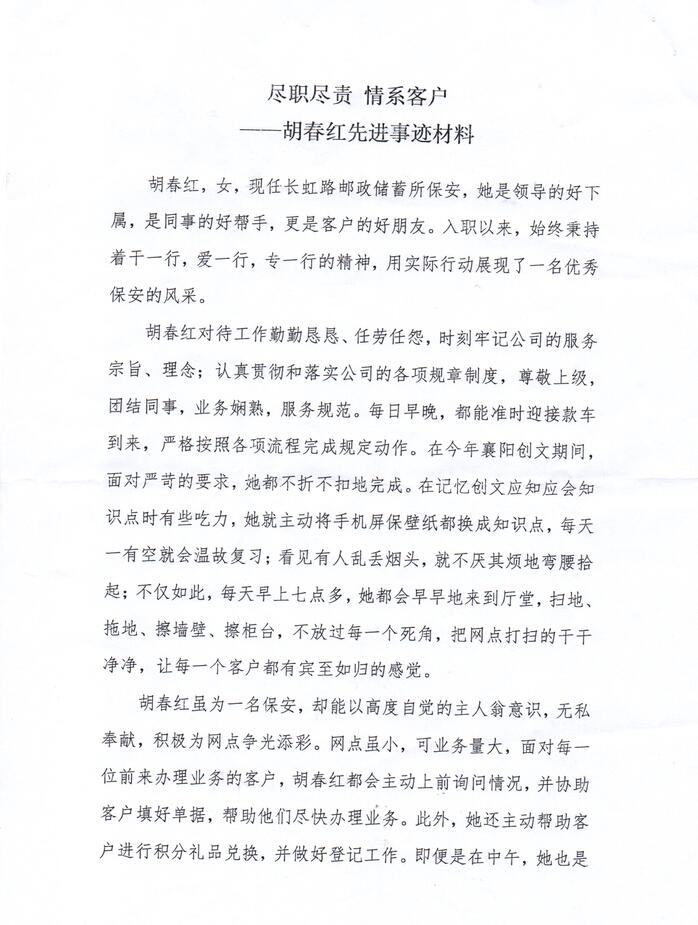 胡春紅,女,現(xiàn)任長虹路郵政儲蓄所保安,她是領(lǐng)導的好下屬,是同事的好幫手,更是客戶的好朋友。入職以來,始終秉持著干一行,愛一行,專一行的精神,用實際行動展現(xiàn)了一名優(yōu)秀保安的風采。胡春紅對待工作勤勤懇懇、任勞任怨,時刻牢記公司的服務(wù)宗旨、理念;認真貫徹和落實公司的各項規(guī)章制度,尊敬上級,團結(jié)同事,業(yè)務(wù)嫻熟,服務(wù)規(guī)范。每日早晚,都能準時迎接款車到來,嚴格按照各項流程完成規(guī)定動作。在今年襄陽創(chuàng)文期間,面對嚴苛的要求,地都不折不扣地完成。在記憶創(chuàng)文應知應會知識點時有些吃力,她就主動將手機屏保壁紙都換成知識點,每天有空就會溫故復習:看見有人亂丟煙頭,就不厭其煩地彎腰拾起;不僅如此,每天早上七點多,她都會早早地來到廳堂,掃地拖地、擦墻壁、擦柜臺,不放過每一個死角,把網(wǎng)點打掃的干干凈凈,讓每一個客戶都有賓至如歸的感覺。胡春紅雖為一名保安,卻能以高度自覺的主人翁意識,無私幸獻,積極為網(wǎng)點爭光添彩。網(wǎng)點雖小,可業(yè)務(wù)量大,面對每位前來辦理業(yè)務(wù)的客戶,胡春紅都會主動上前詢問情況,并協(xié)助客戶填好單據(jù),幫助他們盡快辦理業(yè)務(wù)。此外,她還主動幫助客戶進行積分禮品兌換,并做好登記工作。即便是在中午,她也是匆忙吃過飯后,主動放棄午休,繼續(xù)投入到工作中。由于網(wǎng)點只能辦理金融業(yè)務(wù),有些客戶不知情,進店詢問郵務(wù)類業(yè)務(wù),甚至只是嚼水、問路,胡春紅都會熱情迎客,耐心解答,做到知無不言,言無不盡視客戶如親人,這是胡春紅一直堅持的信念,對待每位客戶胡春紅都做到了來有迎聲,走有送聲,不僅如此,她還想客戶之所想,急客戶之所急她所在的網(wǎng)點有兩位特殊的客戶,由于偏癱,每月都必須由年邁的母親騎著三輪車帶女幾來領(lǐng)低保,母親沒有什么文化,也不會寫字,每次母女兩剛到門口,胡春紅都會馬上迎出門去,攙扶客戶進店,幫助客戶填單,同時還會噓寒問暖,問問母女兩有沒有什么困難需要幫助??蛻羰指屑?多次提出送點禮物給胡春紅,也都被她一一謝絕了。