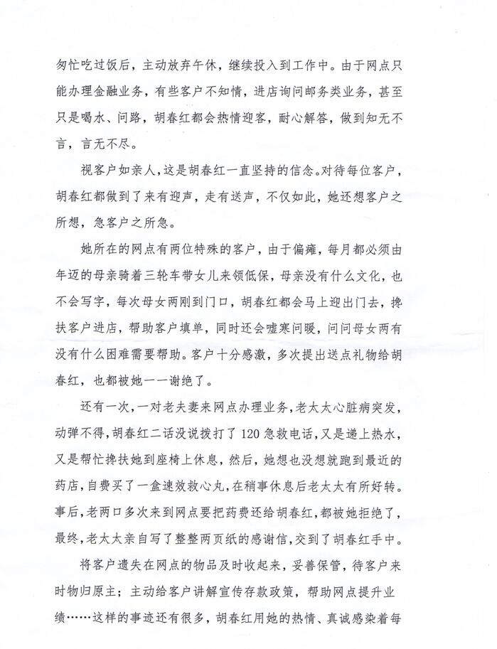 還有一次,一對老夫妻來網(wǎng)點辦理業(yè)務(wù),老大大心臟病突發(fā),動彈不得,胡春紅二話沒說撥打了120急救電話,又是遞上熱水又是幫忙攙扶她到座椅上休息,然后,她想也沒想就跑到最近的藥店,自費買了一盒速效救心丸,在稍事休息后老太大有所好轉(zhuǎn)事后,老兩口多次來到網(wǎng)點要把藥費還給胡春紅,都被她拒絕了,最終,老大大親自寫了整整兩頁紙的感謝信,交到了胡春紅手中。將客戶遺失在網(wǎng)點的物品及時收起來,妥善保管,待客戶來時物歸原主;主動給客戶講解宣傳存款政策,幫助網(wǎng)點提升業(yè)績……這樣的事跡還有很多,胡春紅用她的熱情、真誠感染著每一位前來辦理業(yè)務(wù)的客戶。翻開客戶意見薄,里面密密麻麻地記載了客戶對于胡春紅的贊美與好評,每當想到自已的努力可以真正幫助到客戶,滿滿的成就感就會在胡春紅的心頭漾開,而這也成了她堅持下去的動力。“我在這里上班,我就是這的一份子,我愿意盡我的微薄之力,讓網(wǎng)點辦得更好!”這是胡春紅的心里話,雖然樸實,卻很感人,一如她在這平凡的崗位上,干出的不平凡的成績!
